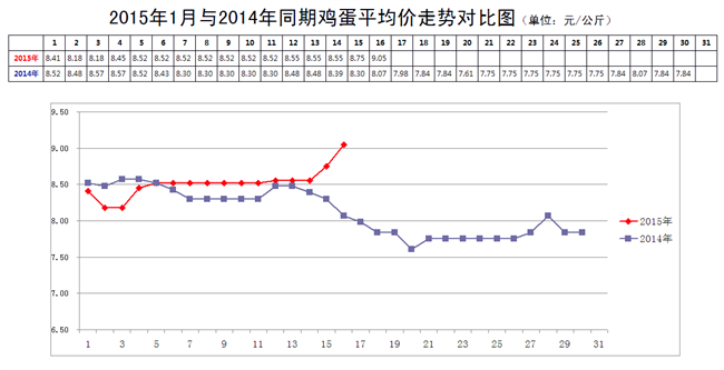 1月16日,新发地市场鸡蛋的批发价是4.52元/斤,比1月9日的4.26元/斤上涨6.10%;比12月16日的4.72元/斤下降4.24%;比2014年1月16日的4.04元/斤上涨11.88%。周环比涨幅较大;月环比小幅下降;年同比涨幅较大。