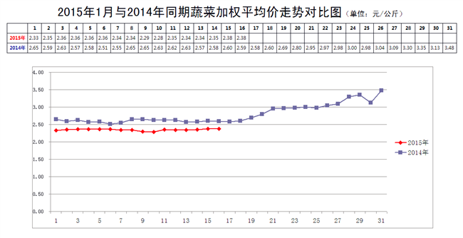 1月16日,新发地市场蔬菜的加权平均价是2.38元/公斤,比1月9日的2.29元/公斤上涨3.93%;比去年同期的2.59元/公斤下降8.11%。周环比涨幅较大;年同比降幅较小。年同比降幅比上周末的13.58%明显收窄。