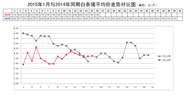 2015年1月16日,新发地市场白条猪的批发平均价是7.68元/斤,比2015年1月9日的7.88元/斤下降2.54%;比2014年12月16日的8.13元/斤下降5.54%;比2014年1月16日的7.88元/斤下降2.54%。周环比小幅下降;月环比降幅明显;年同比降幅比较小。