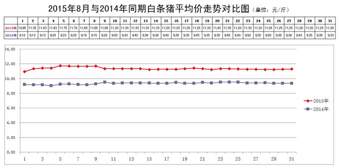 2015年8月份的价格比2014年同期的9.33元/斤上涨21.54%;比2013年同期的9.89元/斤上涨14.66%;比2012年同期的8.92元/斤上涨27.13%;比2011年同期的11.89元/斤下降4.63%。