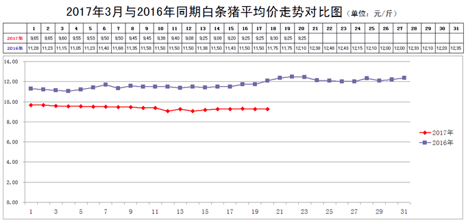 2017年3月17日,新发地市场白条猪的批发平均价是9.25元/斤,比3月10日的9.38元/斤下降1.39%;比2017年2月17日的10.15元/斤下降8.87%;比2016年3月17日11.50元/斤下降19.57%。周环比小幅下降;月环比大幅下降;年同比大幅下降。上周末,年同比下降18.43%,本周同比降幅进一步放大。
