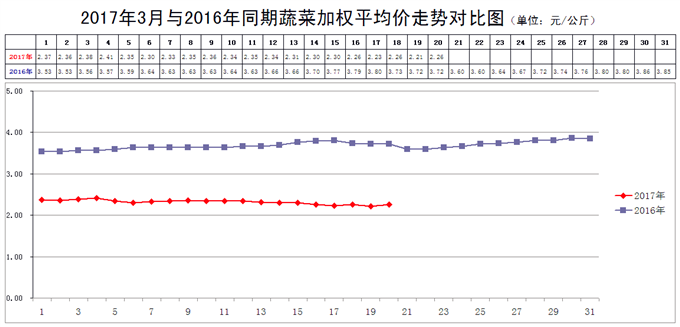 本周内的最高价2.35元/公斤(3月11日),比上周的2.41元/公斤下降2.49%;本周内的最低价2.23元/公斤(3月17日),比上周的2.30元/公斤下降3.04%。本周的最高价出现在周前期,最低价出现在周后期,说明本周菜价总体上是波动下行的。
