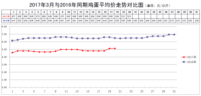3月17日,新发地市场鸡蛋的批发价是2.40元/斤,比3月10日的2.49元/斤下降3.61%;比2016年2月10日的2.33元/斤上涨3%;比2016年3月17日的3.22元/斤下降25.47%。周环比明显回落;月环比小幅上涨;年同比大幅下降。上周末,年同比下降24.77%,本周同比降幅略有放大,本周的价格仍然是近9年同期的最低点。