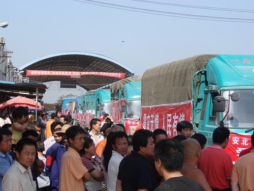 四、从四川地震后,市场每天的交易总量为7000多吨,交易量和价格与去年同时期持平,个别品种的价格有所下降,大概在10%左右,比如:莲花白、白萝卜、莴笋、豆角等,价格下降的原因是种植面积大。