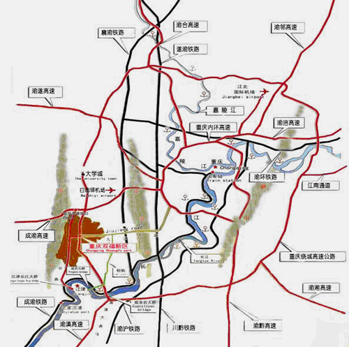 重庆双福国际农贸城项目位于重庆江津双福新区,成渝高速、重庆绕城高速、九江大道、津马大道高等级公路在此纵横交汇,规划的轻轨五号线、七号线在此南北贯穿。紧邻白市驿铁路货站,距西永铁路编组站和集装箱中心10分钟车程、重庆铁路北站30分钟车程、规划的重庆铁路第三客站10分钟车程;距两路寸滩保税港区30分钟车程;距长江黄金水道国家发展改革委批准的重庆“三基地四港区”物流体系中的黄磏港10分钟车程;距江北国际机场30分钟车程;距重庆主城解放碑中央商务区(CBD)30分钟车程。