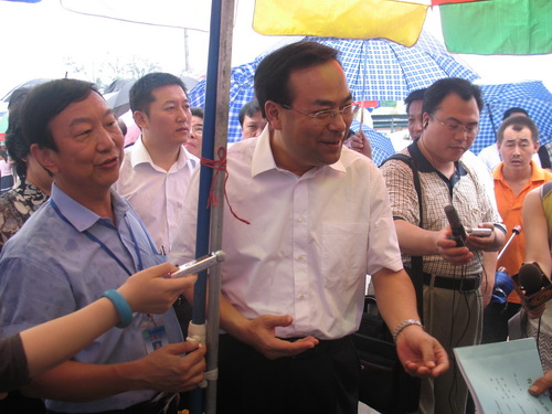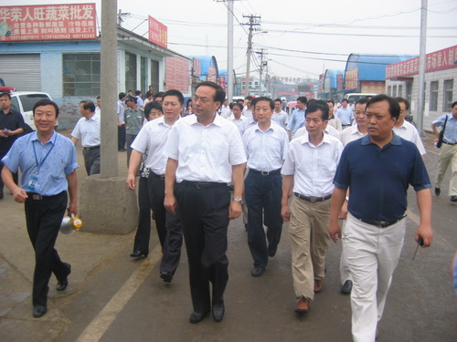 7月14日上午九点四十分,农业部部长孙政才在北京市委常委牛有成、市农委主任王孝东、昌平区区委书记关成华、区长金树东等领导的陪同下冒雨对奥运期间昌平区水屯市场农产品供应情况进行了视察。