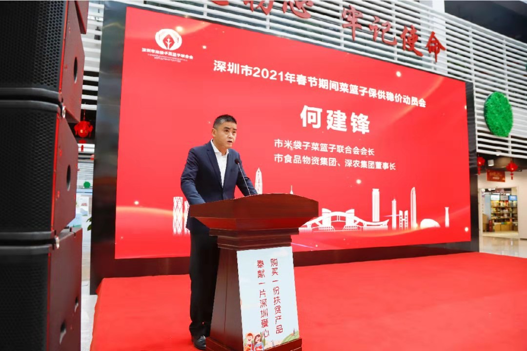 市米袋子菜篮子联合会会长,深圳市食品物资集团、深农集团董事长何建锋代表市米袋子菜篮子联合会宣读保供稳价倡议书,倡议市米菜联各会员单位、全市农贸农批市场、商超积极响应市委、市政府“留深过年”的号召,承担社会责任,主动担当作为,确保春节期间农产品调得进、供得上、不脱销、不断档,确保市场供应充足、种类丰富、品质优良,确保节日期间不停业、不歇业,让市民留深过年买得放心、吃得安心。